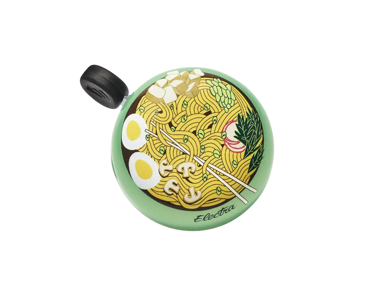 פעמון ירוק מבית Electra עם הדפס קערת ראמן טעימה שיודיע לכולם שאתם בדרך. האטריות המסולסלות והביצה החתוכה מוסיפים טאץ' של אסיה לאופניים שלכם