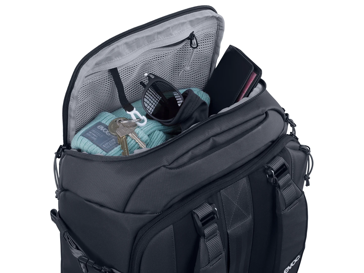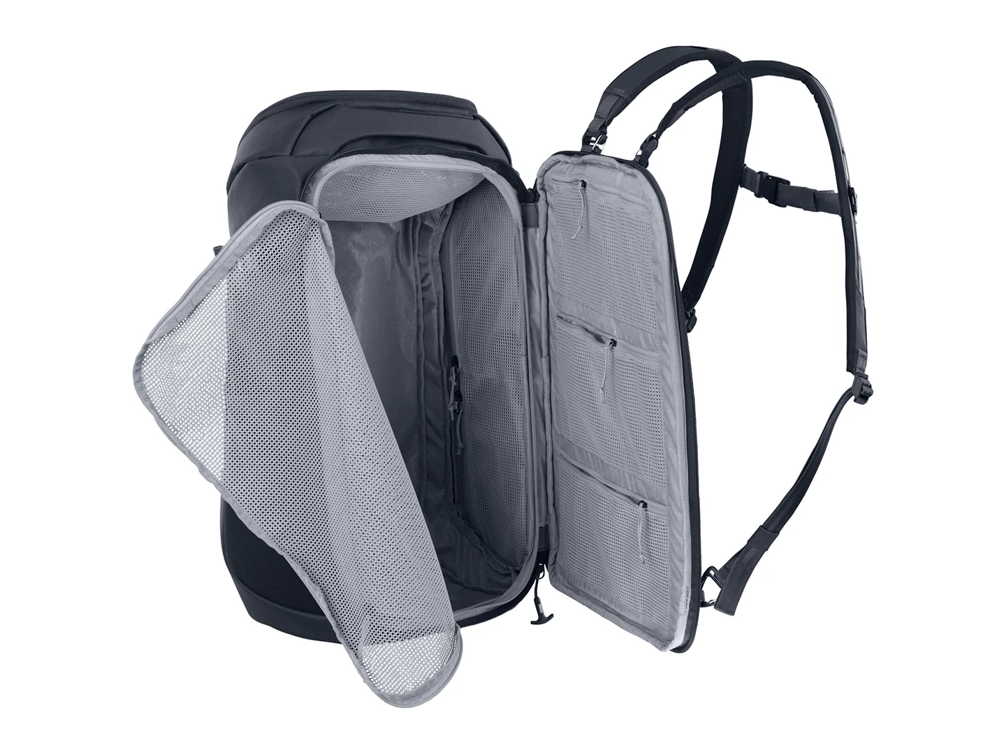 - שני תאים מרכזיים גדולים לנעליים, קסדה או ביגוד, וכן כיס צדדי עם רוכסן הכולל חיבורים לפריטי ציוד קטנים יותר